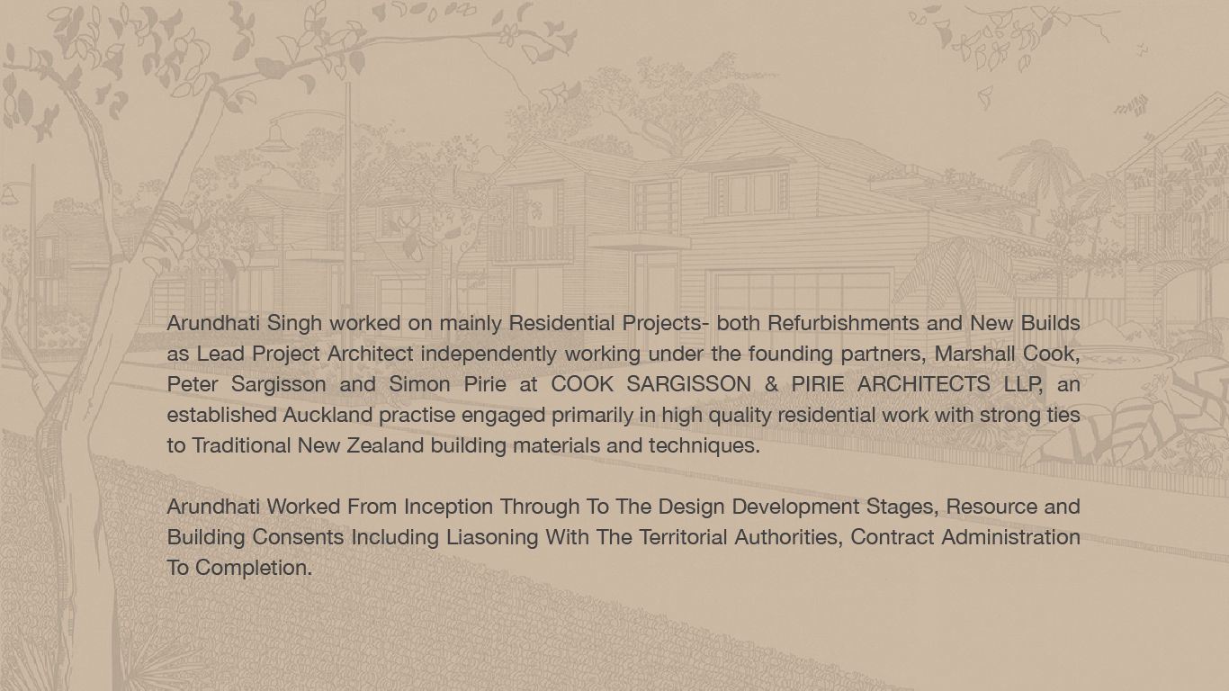 Arundhati is an architect, registered in New Zealand, Australia and India. Prior to establishing her own firm, Arundhati worked with CZWG Architects in London and Cook Sargisson & Pirie Architects in Auckland.